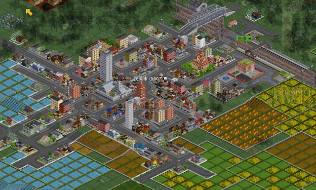南端のターミナル付近に出現していた工場が廃業したので、予定通り直進線路を建設。南端ターミナル都市にビルを多数建設して都心を形成。